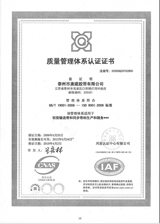 泰州市康建膠帶有限公司經過十多年的發(fā)展已經成為一家從事輸送帶和傳動帶類及相關設備生產和銷售的公司。位于中國經濟發(fā)達的長三角經濟圈江蘇省泰州市高港區(qū),交通發(fā)達。我司以“合格的產品,滿意的服務”為宗旨,發(fā)揚團結、開拓、拼搏爭先的創(chuàng)業(yè)精神,“康建”在全國行業(yè)樹立了良好的企業(yè)形象。“康建”產品已通過ISO9001國際質量體系認證,從原料﹑工藝等方面進行了嚴格的控制,從而確保了產品質量的穩(wěn)定可靠,成為各......